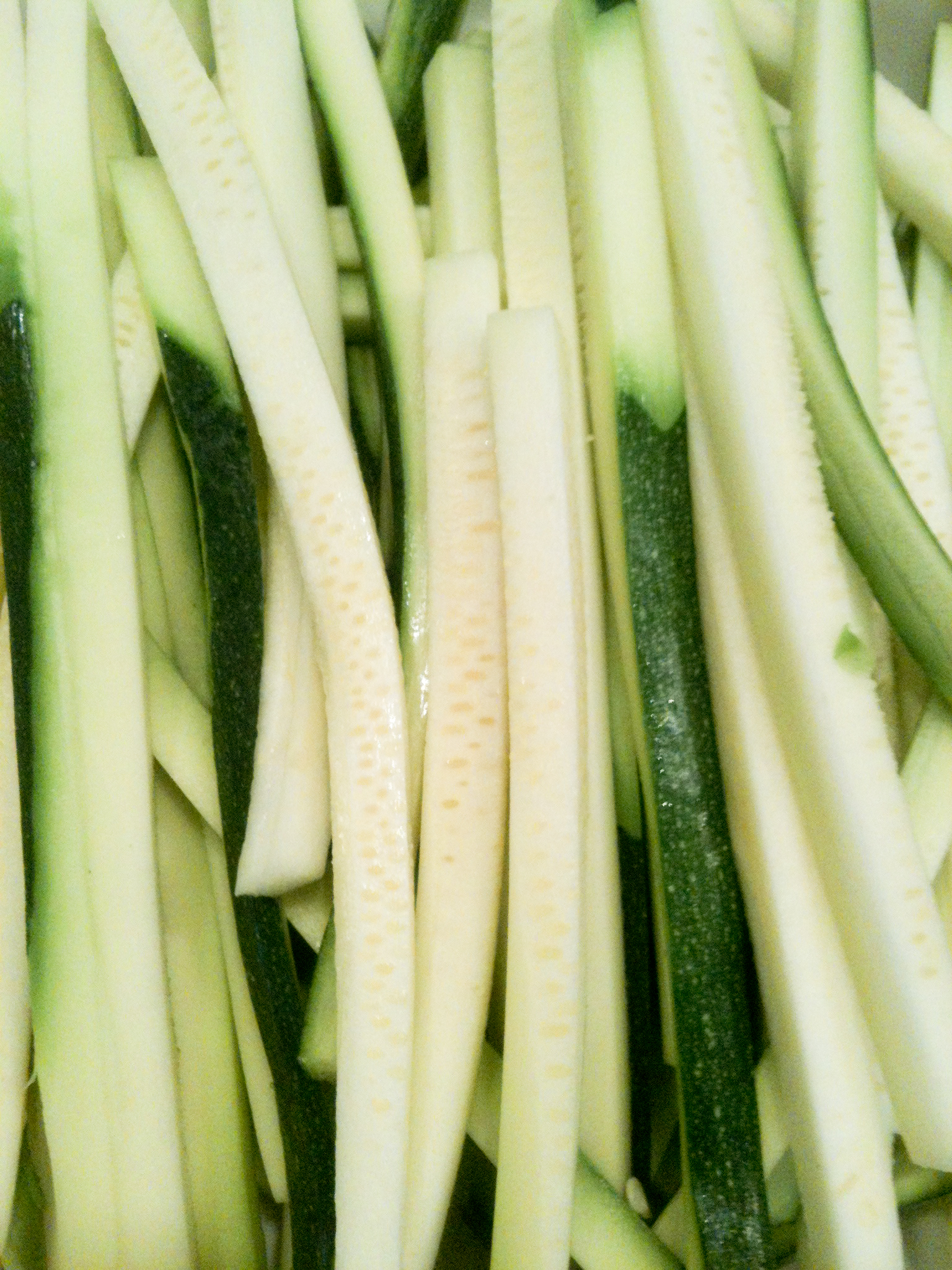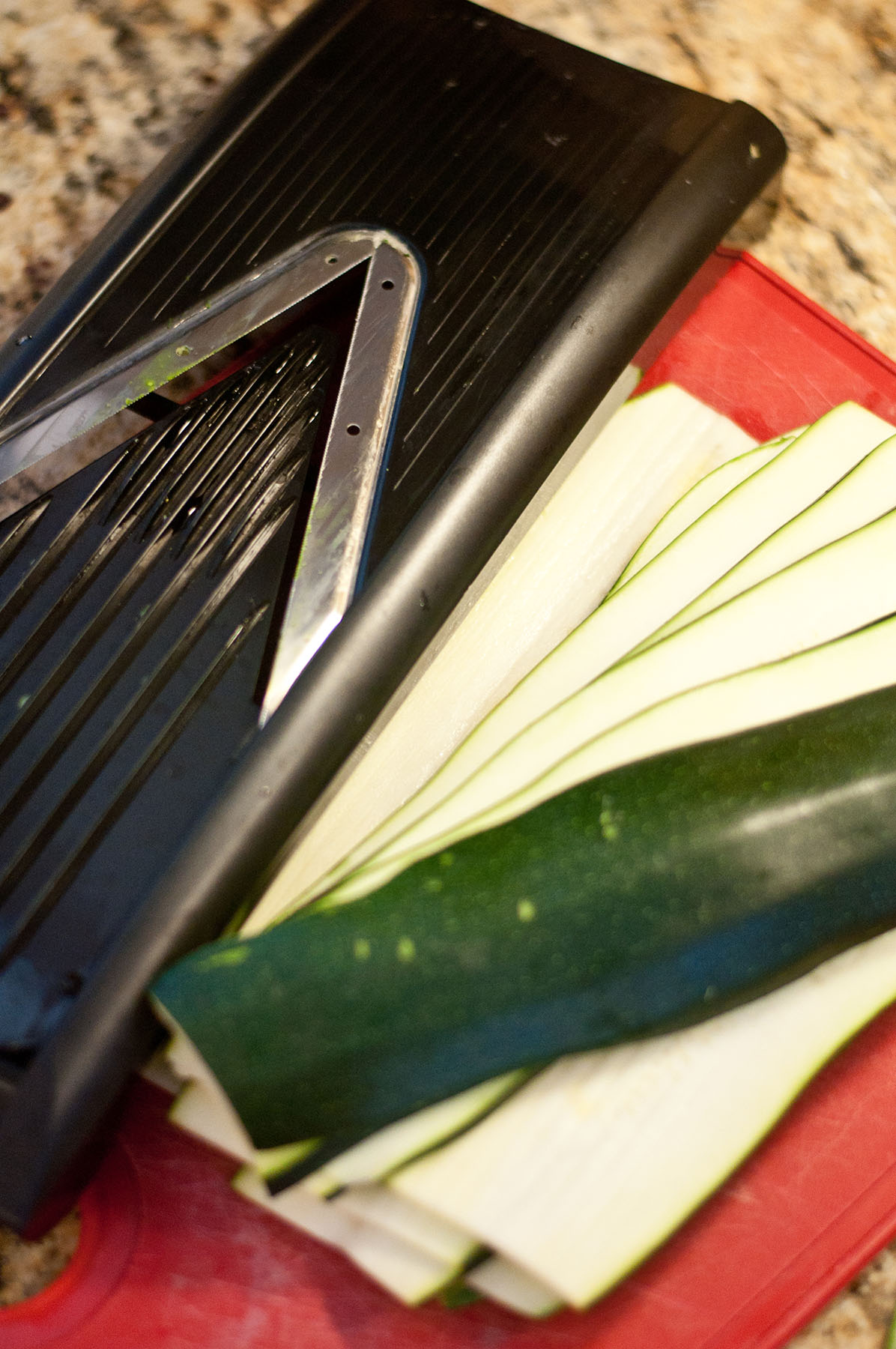 Ok, so maybe all this dip it in hummus party is getting boring. Or maybe you snagged a summer cold from that double dipper and need to stock up on some vitamin C. After all, zucs are high in this powerful antioxidant and pack the most punch raw. A one cup serving (196g) boasts 58% of your daily value. For more Health Benefits of Zucchini check out yesterdays spiel. I sliced up these bueauts with a handy contraption I would have never bought called the chef’s envy. It was a gift from a bff that sat in the box for way too long before I discovered how awesome it really is. She bought it from a guy doing demos at Ralphs, something I would have also never done but what are friends for! I’m sure a knife would suffice but gadgets are fun.