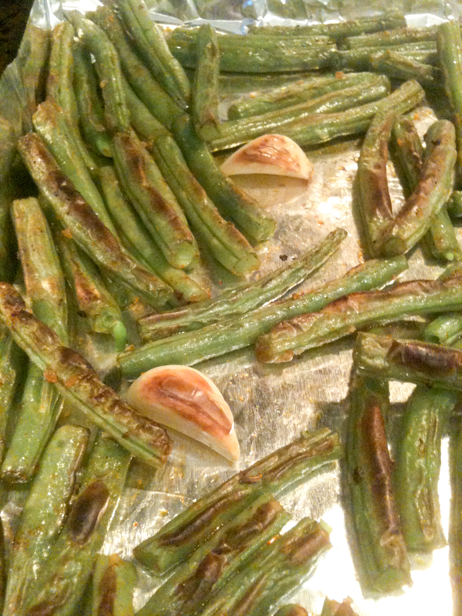 -Next set the oven to broil on high. Toss green beans and whole garlic cloves with 2tbl olive oil and 1tsp of season salt. I had a fancy citrus sea salt which is mixed with herbs, but whatever you have is ok too. I also sprinkled fresh ground pepper and paprika using the good ole “eye ball method.” It’s really about personal taste, we like peppery foods so I’m not shy with the pepper but also know not to go overboard.
