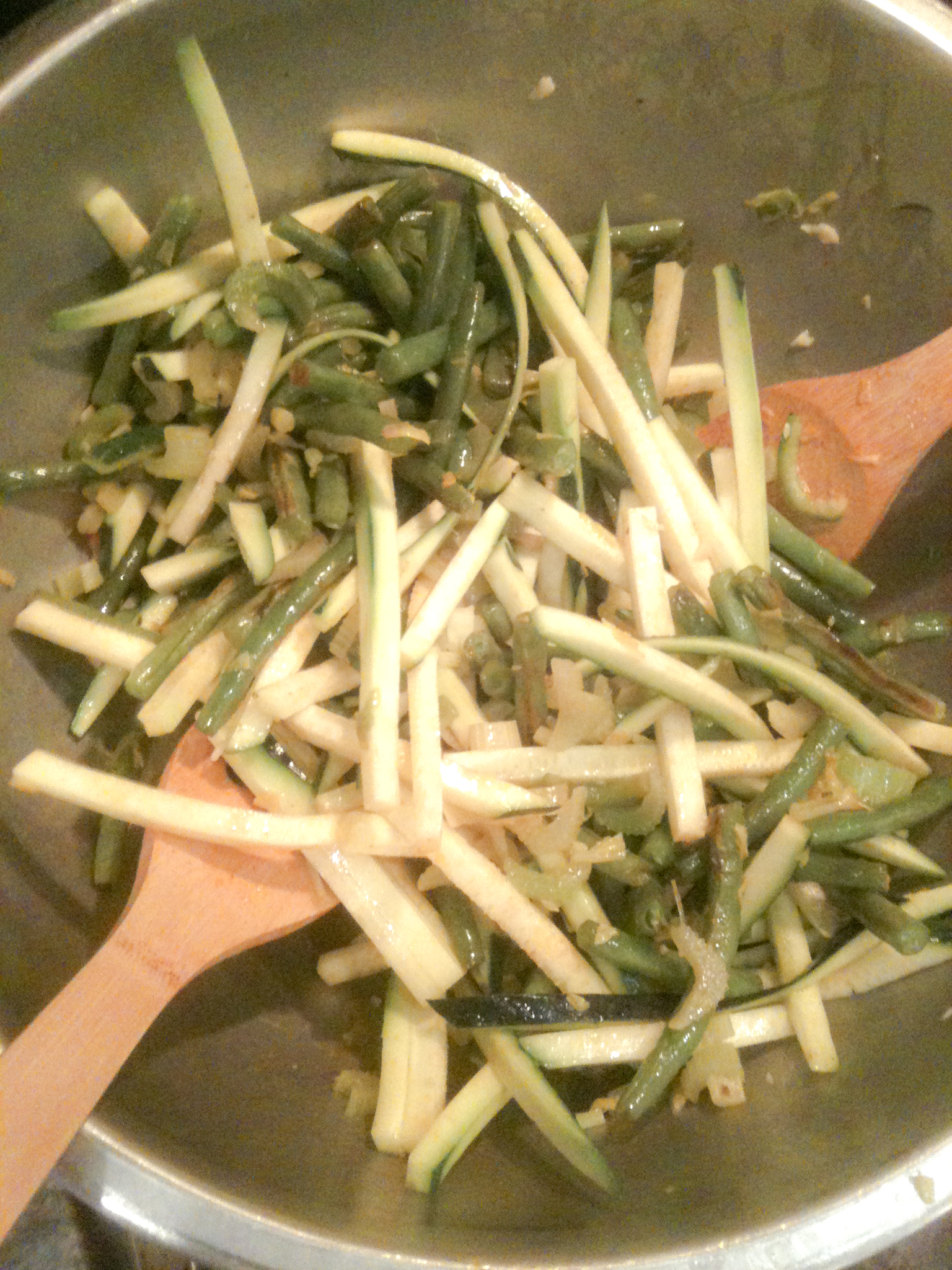 -Its a good habit to prep veggies and get ingredients ready first. This makes cooking go smoother instead of frantically cutting veggies while something is burning. Cut the zucchini and set aside to add last. Chop celery, green pepper and peel garlic. I chose to snap the ends off the green beans and snap in half because I get all nostalgic thinking about how I used to do it with my great-grandmother that way when I was small. But it’s not necessary for broiling.