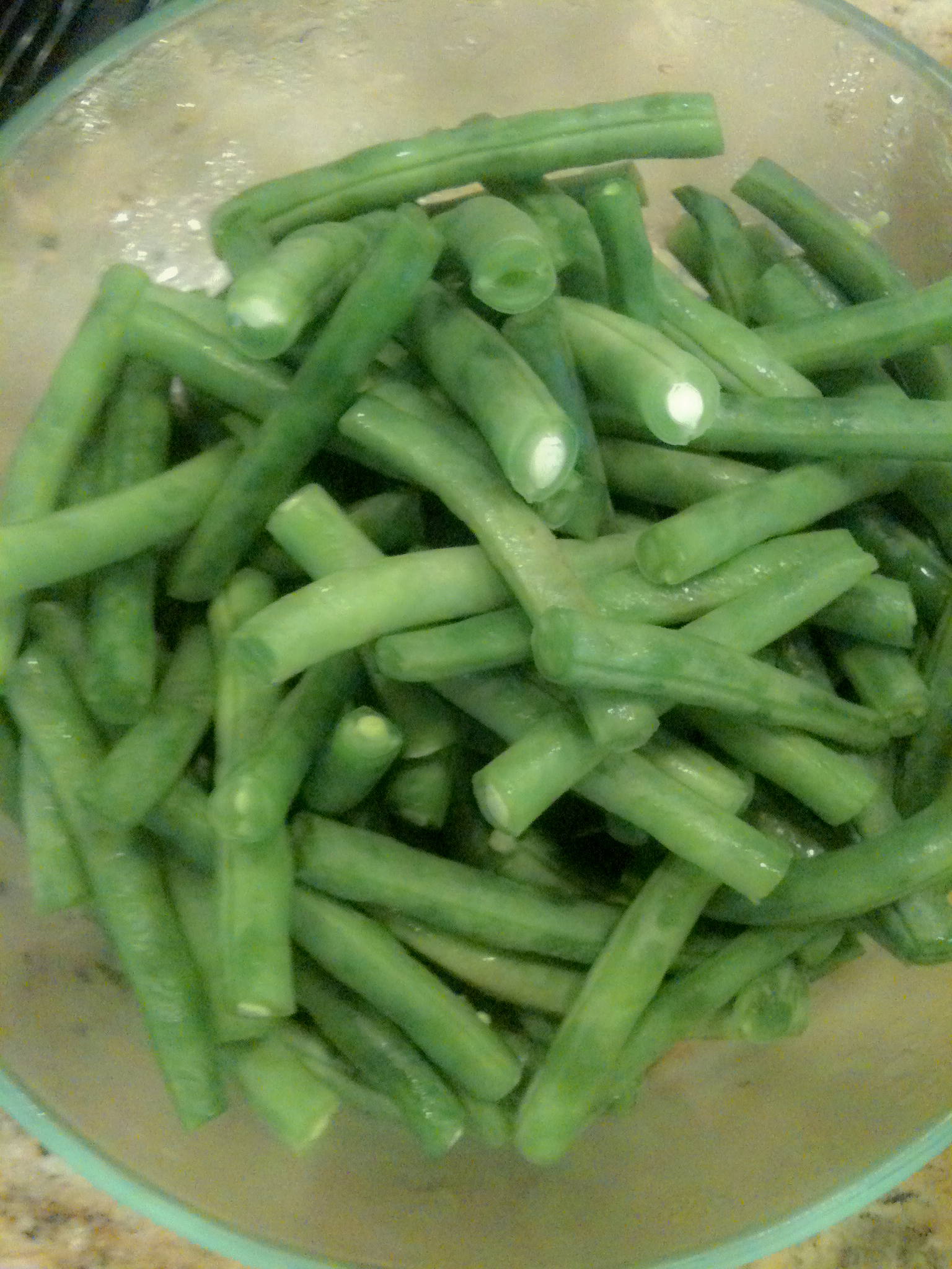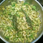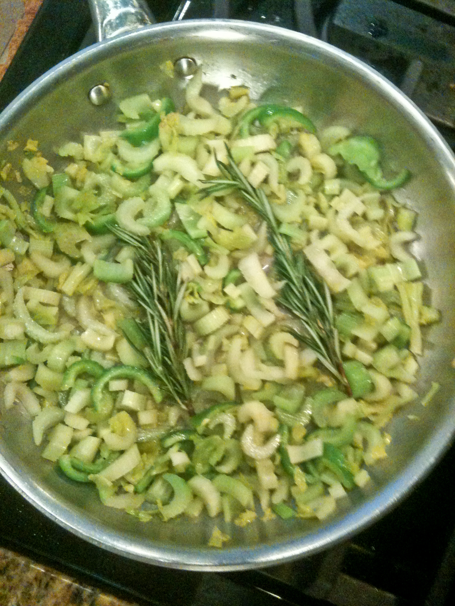 -Then while the oven is preheating sauté the celery and green pepper with 1tbl of olive oil and the rosemary sprigs over medium heat for about 3 minutes. Then add the rice vinegar and simmer on low covered while you cook the green beans. if there is too little liquid you can add water a tablespoon at a time until you have just enough to simmer.